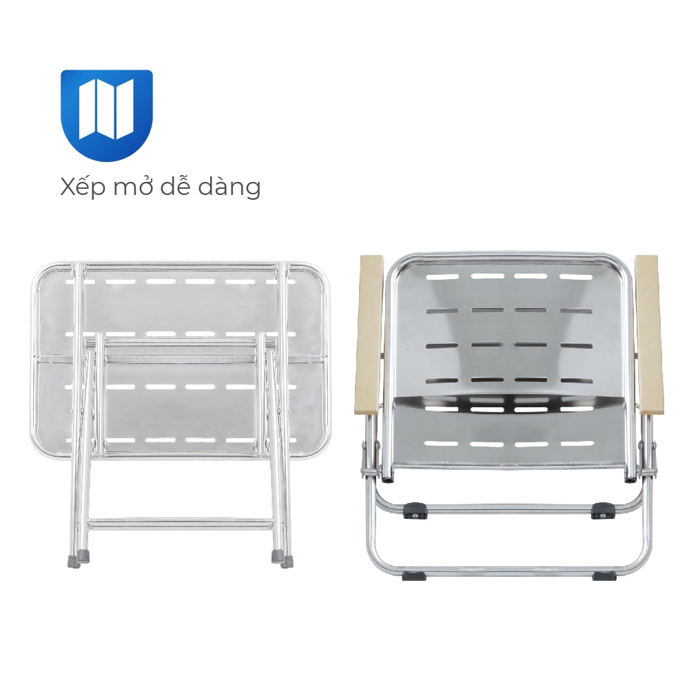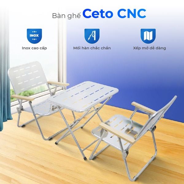 Bộ bàn ghế Ceto CNC với chất liệu inox cao cấp chống gỉ, mối hàn chắc chắn và thiết kế xếp mở nhanh chóng. Sản phẩm vừa chịu được thời tiết ngoài trời, vừa mang vẻ hiện đại, sang trọng cho không gian. Kích thước gọn gàng, dễ vệ sinh và bảo quản, phù hợp sử dụng từ gia đình, quán cà phê, quán ăn vỉa hè đến các buổi dã ngoại ngoài trời.
