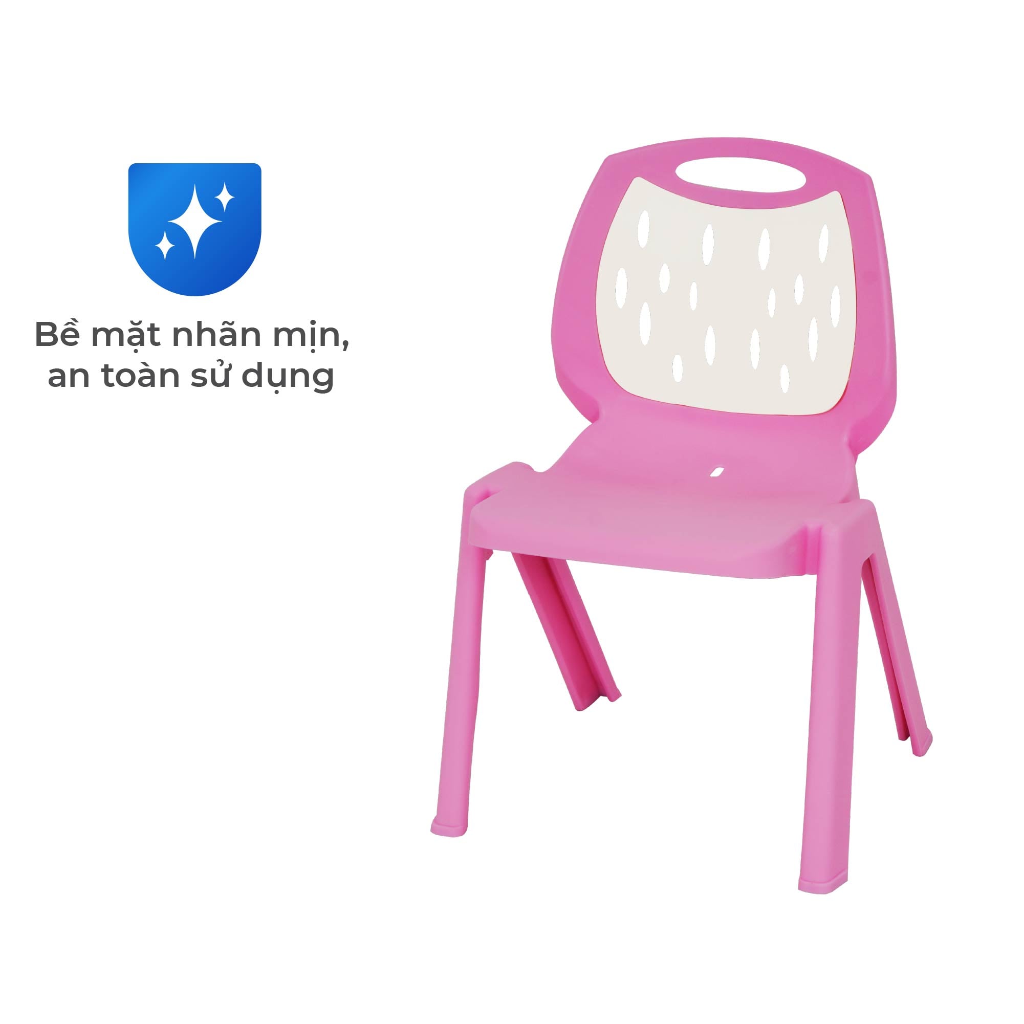 | ƯU ĐIỂM VƯỢT TRỘI- Nhựa PP nguyên sinh – an toàn, không độc hại. - Tựa lưng bo cong ôm dáng – hỗ trợ tư thế ngồi đúng chuẩn. - Thiết kế đục lỗ – tạo sự thông thoáng khi ngồi lâu. - Kết cấu chắc chắn, góc bo tròn – đảm bảo an toàn tuyệt đối. - Trọng lượng nhẹ – bé tự di chuyển dễ dàng. - Màu sắc bắt mắt – tạo hứng thú cho bé khi học và chơi.