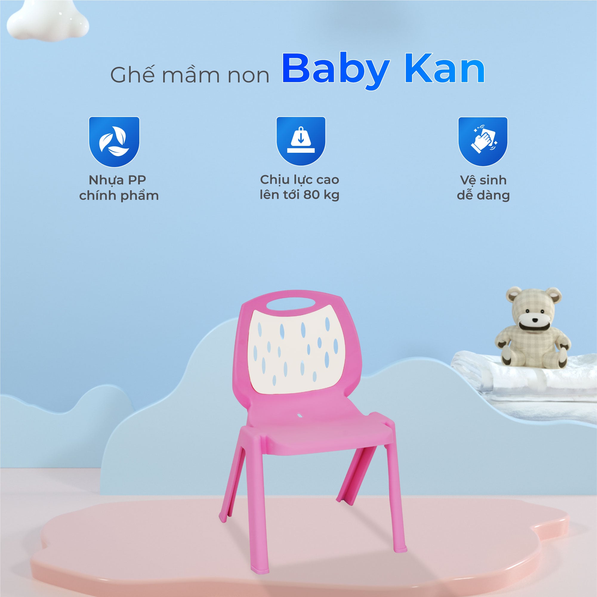Ghế Baby Kan được làm từ nhựa PP nguyên sinh cao cấp, tuyệt đối an toàn cho sức khỏe trẻ nhỏ, không chứa chất độc hại. Thiết kế tựa lưng bo cong ôm trọn dáng ngồi, giúp bé duy trì tư thế chuẩn, hạn chế cong vẹo cột sống ngay từ những năm đầu đời.Với kết cấu chắc chắn, các góc bo tròn, sản phẩm đảm bảo an toàn tuyệt đối cho bé khi sử dụng.