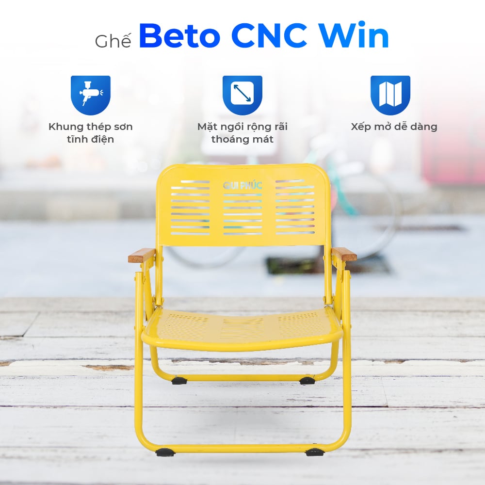 Ghế Beto CNC Win có thiết kế gập gọn tiện lợi, khắc phục triệt để nhược điểm ghế không xếp được gây tốn diện tích. Phần lưng ghế cố định chắc chắn, hỗ trợ tư thế ngồi thoải mái hơn, không còn cảm giác mỏi lưng khi ngồi lâu. Kiểu dáng CNC thoáng khí giúp loại bỏ sự bí nóng, đồng thời tạo điểm nhấn hiện đại mang phong cách sân vườn tự nhiên, phù hợp cho gia đình, quán café hay không gian ngoài trời.