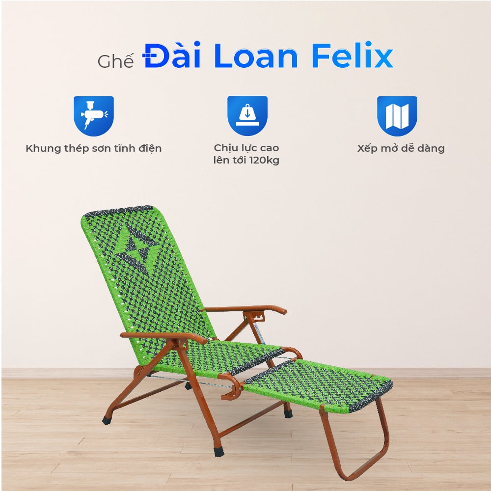 Ghế du lịch Đài Loan Felix có khung sắt sơn tĩnh điện chắc chắn, chống gỉ sét, khắc phục nhược điểm khung yếu ọp ẹp, thiếu bền chắc. Mặt ngồi đan dây Đài Loan co giãn nhẹ, êm ái và thoáng khí, loại bỏ cảm giác nóng bí khi ngồi lâu. Thiết kế lưng ghế ngả sâu kèm gác chân dài cho phép người dùng duỗi người nghỉ ngơi thư giãn hoàn toàn. Đặc biệt, ghế có cơ chế gấp gọn linh hoạt, tiện di chuyển và tiết kiệm diện tích lưu trữ.