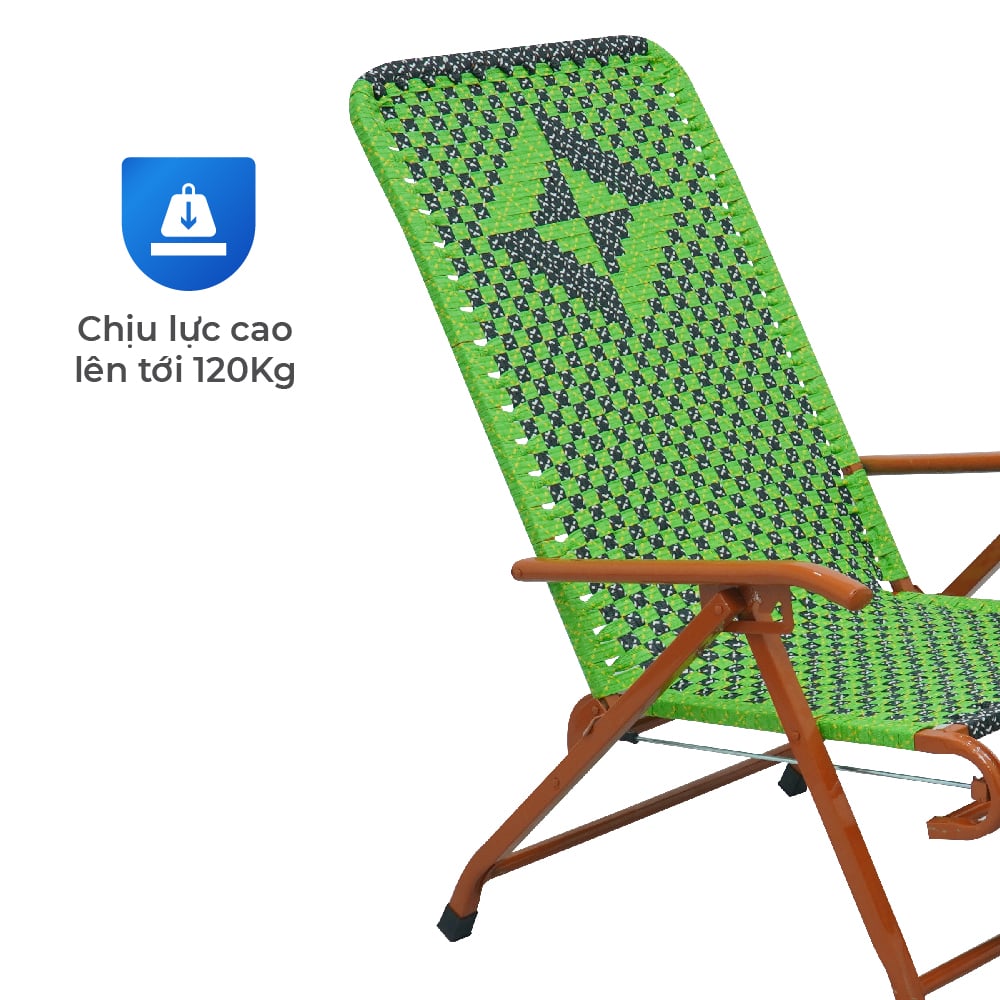 - Mặt ghế và tựa lưng đan dây nhựa tổng hợp kiểu Đài Loan, với độ co giãn nhẹ – giúp ngồi êm ái, thoáng khí, không bị nóng lưng khi ngồi lâu. - Tựa lưng ngả sâu kết hợp phần gác chân tạo thành tư thế nằm thư giãn thoải mái, lý tưởng để đọc sách, chợp mắt hoặc nghỉ ngơi giữa ngày. - Thiết kế xếp gọn linh hoạt, dễ dàng mang theo hoặc cất giữ sau khi dùng – đặc biệt phù hợp với người sống trong căn hộ nhỏ hoặc thường xuyên đi công trình.