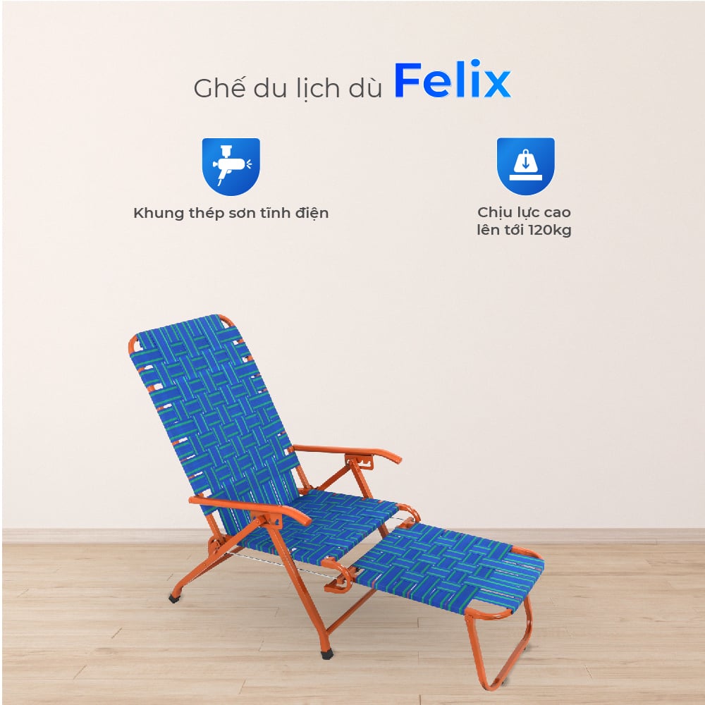 Ghế du lịch dù Felix thiết kế ngả lưng sâu kết hợp gác chân mang đến tư thế thư giãn tối đa cho cổ, vai và thắt lưng, có khung sắt sơn tĩnh điện bền chắc, chống gỉ sét, khắc phục nhược điểm của những loại ghế kém chất lượng nhanh hỏng và chiếm chỗ. Đặc biệt, ghế có thể gấp gọn linh hoạt, tiện lợi khi cất giữ hoặc mang đi dã ngoại, picnic hay câu cá.