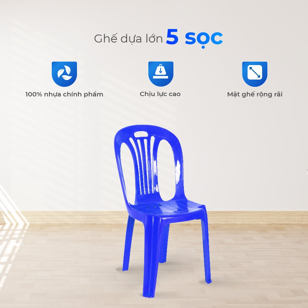 Ghế dựa lớn 5 sọc thiết kế lưng tựa với 5 sọc thẳng thoáng khí, giúp nâng đỡ cơ thể và ngồi lâu không bị nóng, thay thế cho những chiếc ghế không có tựa khiến lưng nhanh mỏi. Dáng ghế cao với mặt ngồi rộng rãi mang lại sự thoải mái cho nhiều đối tượng người dùng, trong khi kết cấu liền khối chắc chắn, dễ lau chùi và không cần lắp ráp. Ngoài ra, ghế có thể xếp chồng gọn gàng, thuận tiện cho việc lưu trữ hoặc di chuyển với số lượng lớn, phù hợp cho gia đình, quán ăn và nhà hàng.