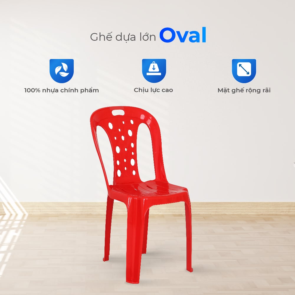 Ghế dựa lớn Oval với thiết kế lưng ghế với các lỗ oval thoáng khí vừa tạo điểm nhấn thẩm mỹ, vừa giúp ngồi lâu không bị bí lưng, khắc phục tình trạng lưng ghế không ôm khiến trải nghiệm kém thoải mái. Nhựa chính phẩm cao cấp, dẻo bền và chịu lực tốt, thay thế cho những chiếc ghế dễ gãy, cong vênh khi sử dụng lâu dài.