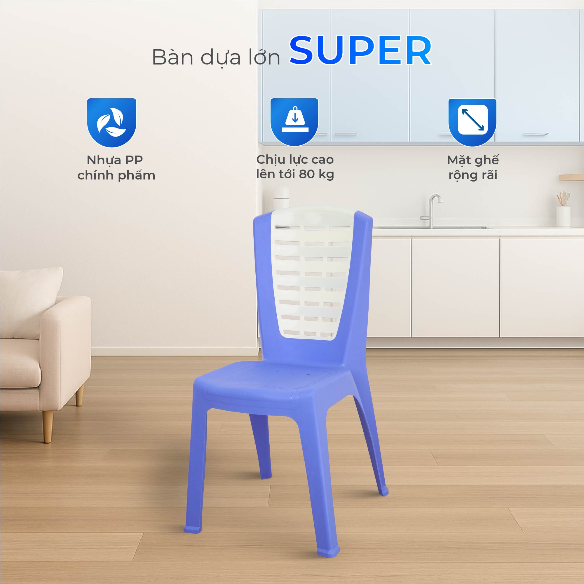 Ghế dựa Super cao được làm từ hạt nhựa và hạt màu chính phẩm, bền màu và bóng đẹp, giúp bạn an tâm sử dụng lâu dài mà không lo nhựa giòn dễ gãy như những loại ghế kém chất lượng. Thiết kế nguyên khối chắc chắn với bốn chân rộng, phần tựa lưng có nhiều khe thoáng khí và được gia cố nan chịu lực, khắc phục triệt để nỗi lo ghế không có tựa hoặc lưng cứng, thiếu thoải mái.