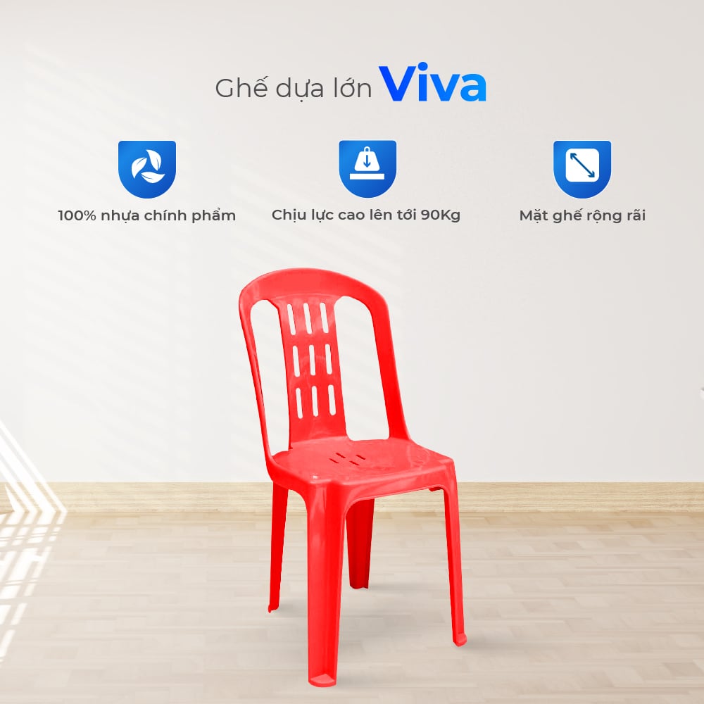 Ghế VIVA được làm từ nhựa chính phẩm bền chắc, an toàn, khắc phục hoàn toàn tình trạng chân ghế mỏng yếu, nhựa giòn dễ gãy khi sử dụng lâu dài Mặt ngồi rộng tạo cảm giác thoải mái khi ngồi lâu, trong khi chân ghế có nút chống trượt giúp tăng độ bám, đảm bảo an toàn và bảo vệ sàn nhà. Nhờ bổ sung chất chống tia UV, sản phẩm giữ màu tươi sáng, không phai sạm khi dùng ngoài trời.
