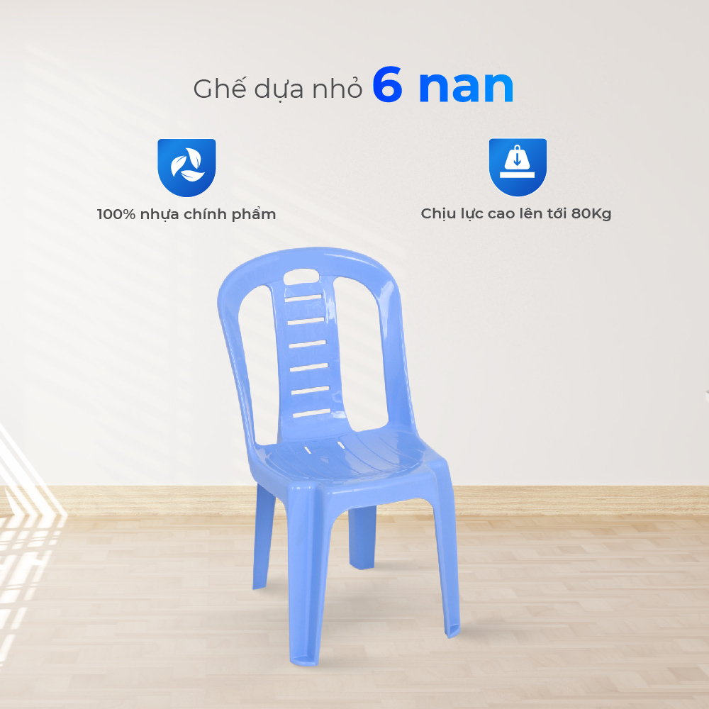 Ghế dựa nhỏ 6 nan làm từ nhựa nguyên sinh cao cấp, bền chắc và chịu lực tốt, thay thế cho những chiếc ghế nhựa giòn dễ gãy, không an toàn khi ngồi. Lưng ghế 6 nan vững chắc giúp nâng đỡ cột sống, khắc phục nỗi lo ghế ọp ẹp, thiếu sự thoải mái. Bề mặt ghế trơn láng, không góc cạnh, loại bỏ nguy cơ trầy xước da khi sử dụng.
