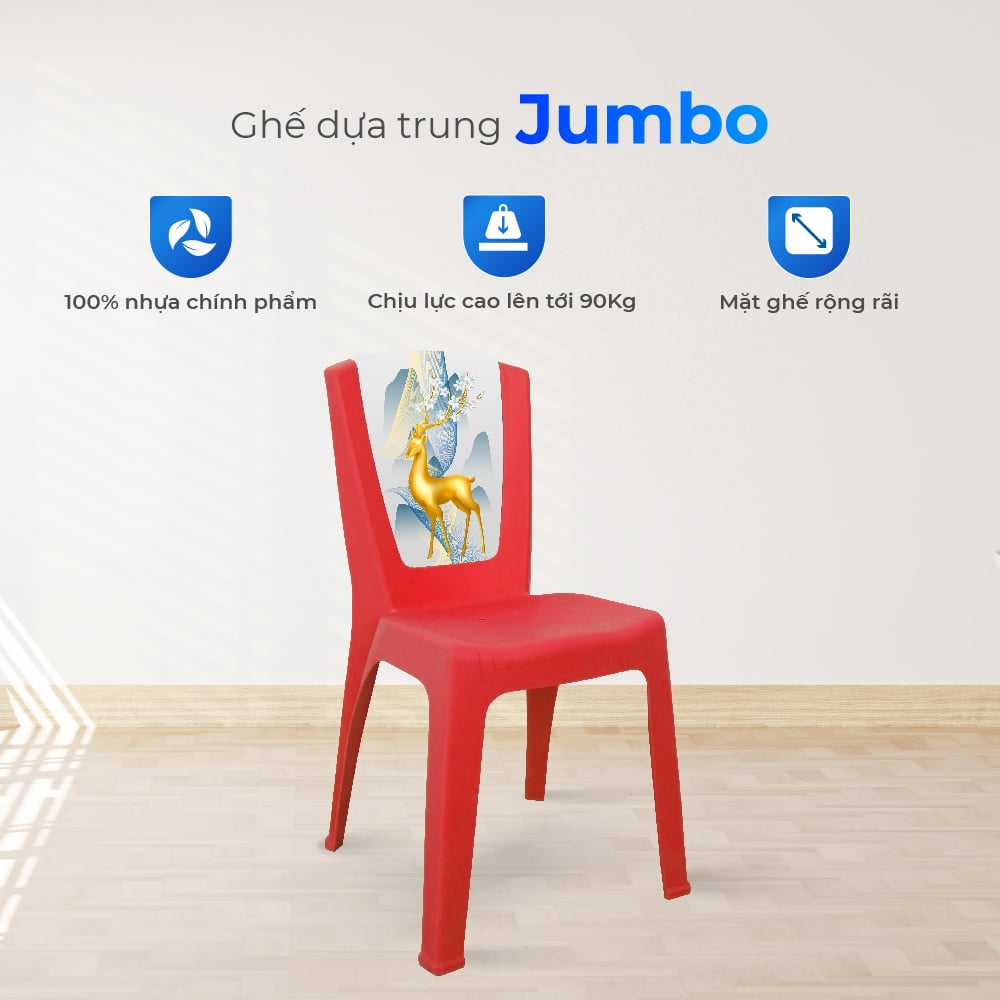 Ghế dựa trung Jumbo chiếc ghế nhựa hiện đại với thiết kế lưng tựa cong nhẹ, mang đến cảm giác thoải mái và thư giãn tối đa khi ngồi lâu. Chất liệu nhựa chính phẩm 100% giúp ghế bền bỉ, không phai màu dưới nắng, giải quyết nỗi lo hư hỏng khi dùng ngoài trời. Dễ xếp chồng gọn gàng – lựa chọn lý tưởng cho không gian sống và kinh doanh.