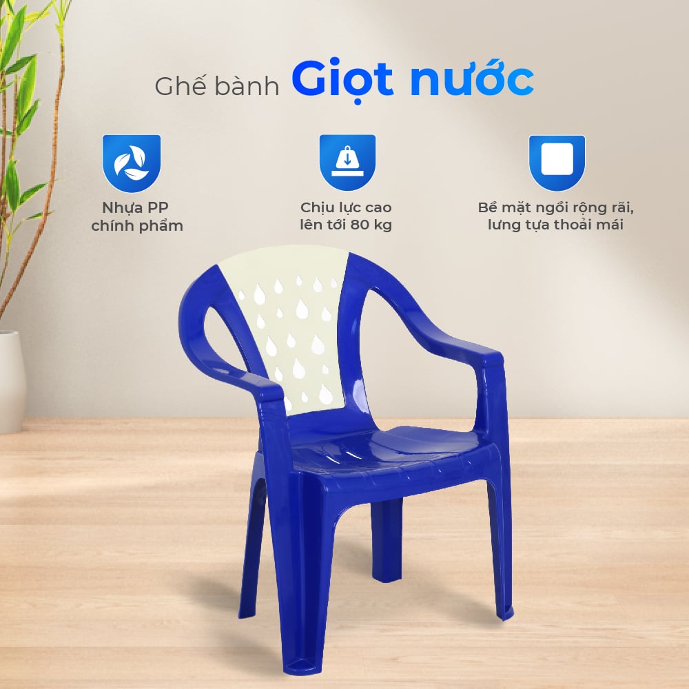 Ghế bành giọt nước được sản xuất từ nhựa chính phẩm dày dặn, dẻo dai và chịu lực tốt, khắc phục hoàn toàn tình trạng ghế mỏng yếu dễ gãy chân, mang lại sự an tâm khi ngồi. Nhờ bổ sung chất phụ gia chống tia UV, ghế giữ được màu sắc tươi sáng suốt hơn nhiều năm, không phai màu hay giòn nứt khi để ngoài trời.