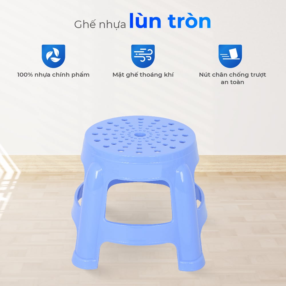 Ghế nhựa lùn tròn làm từ nhựa chính phẩm dẻo dai, chắc chắn và an toàn cho sức khỏe, khắc phục nỗi lo ghế kém chất lượng dễ gãy khi ngồi. Bề mặt ghế mịn màng, không có bavie thừa hay góc cạnh sắc nhọn, loại bỏ hoàn toàn tình trạng gây trầy xước tay thường gặp ở các mẫu ghế ngồi bệt khác. Thiết kế nhẹ, dễ di chuyển nhưng vẫn vững chãi khi ngồi, phù hợp cho gia đình và quán ăn.