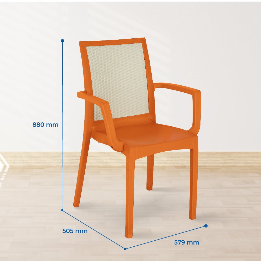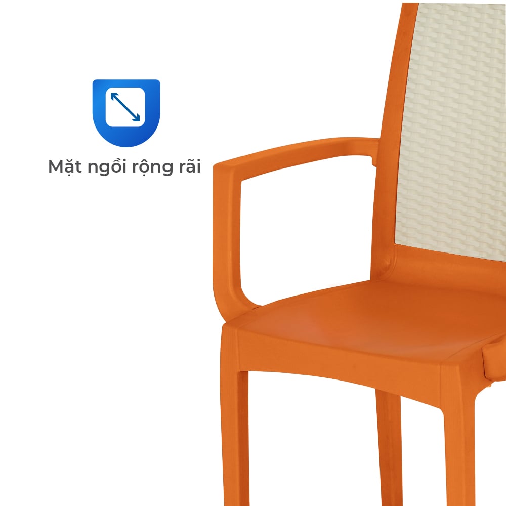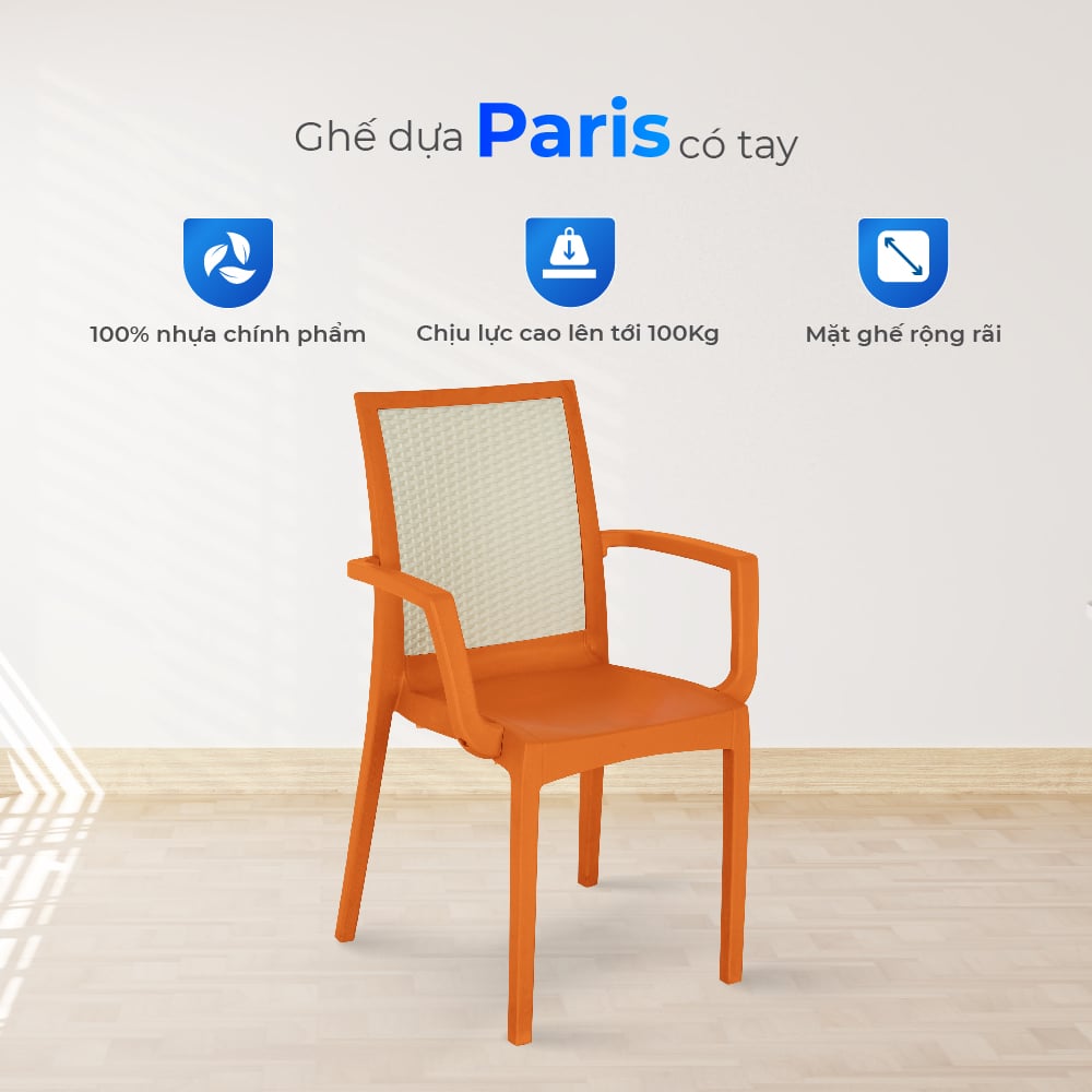 Ghế Paris có tay sản xuất từ 100% nhựa nguyên sinh với công nghệ ép khí Nitơ độc quyền, tạo chân ghế rỗng nhưng cứng cáp, bề mặt căng bóng và chịu lực vượt trội, khắc phục triệt để tình trạng chân ghế giòn gãy, kém an toàn. Thiết kế có lưng tựa và tay vịn giúp nâng đỡ cơ thể, giải quyết nỗi lo ngồi lâu dễ mỏi lưng và thiếu thoải mái. Nhờ bổ sung phụ gia chống UV, sản phẩm giữ màu bền đẹp, không sạm phai ngay cả khi đặt ngoài trời. Đặc biệt, lưng ghế đa dạng với 3 kiểu: nan, bi hoặc mây, mang đến sự linh hoạt theo gu thẩm mỹ người dùng.