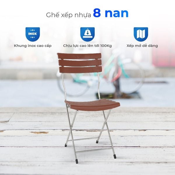 Ghế xếp nhựa 8 nan được thiết kế mặt ngồi 8 nan giúp thoáng khí, hạn chế bí lưng khi ngồi lâu, chất liệu nhựa chính phẩm bền chắc chịu lực tốt, kết hợp cơ chế gấp gọn và xếp chồng tiện lợi. Nhờ vậy, bạn sẽ không còn nỗi lo ghế nhanh hỏng, ọp ẹp, khó cất trữ hay chiếm nhiều diện tích trong không gian gia đình, quán ăn và quán cà phê.