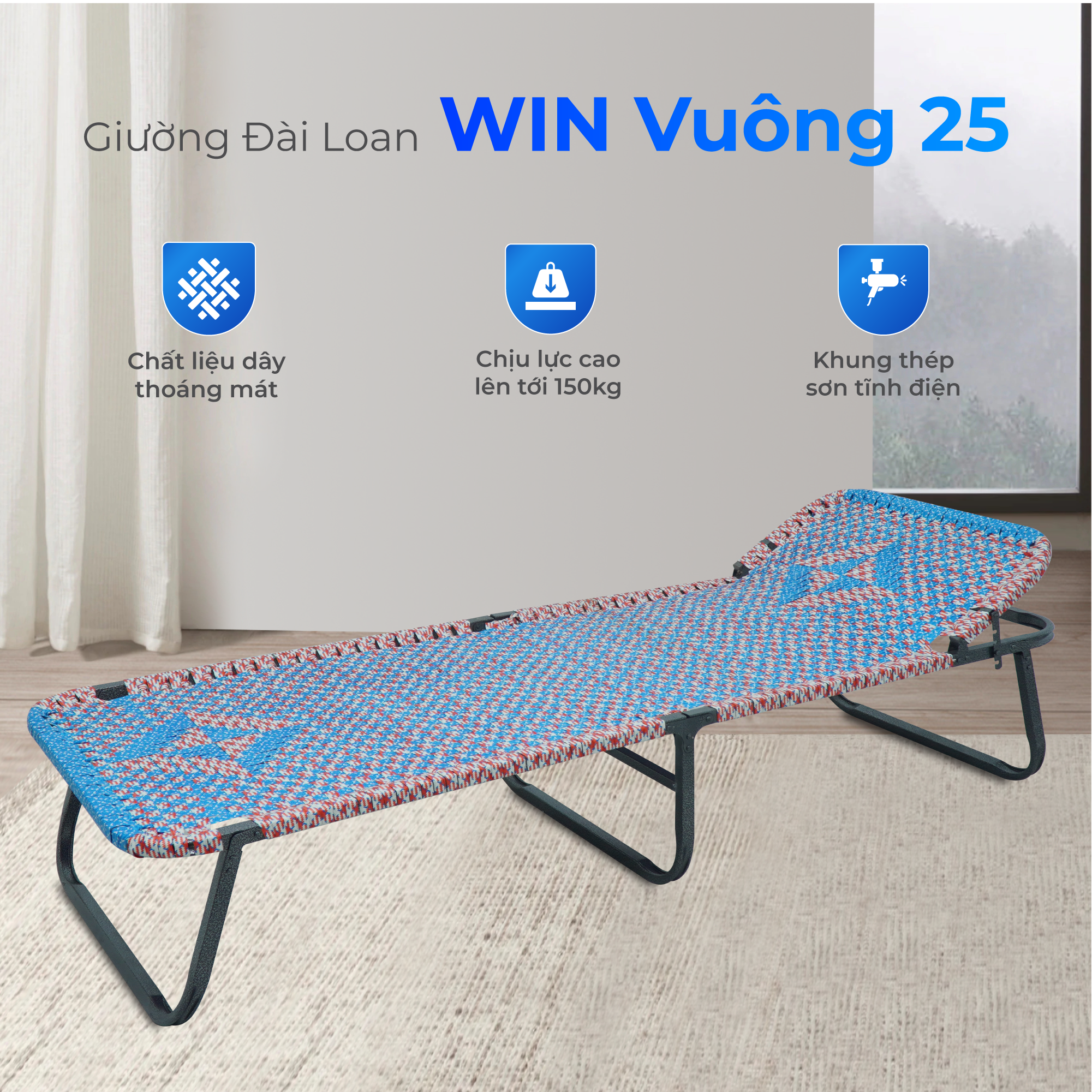 Giường Đài Loan Win thiết kế gập gọn thông minh, tiết kiệm diện tích và tiện mang theo khi cần, kết hợp khả năng chịu lực tốt, ít rung lắc, đảm bảo sử dụng bền lâu. Khung thép sơn tĩnh điện chắc chắn, chống gỉ sét, khắc phục nỗi lo giường ọp ẹp, phát ra tiếng cót két khi nằm. Mặt nằm đan dây Đài Loan thoáng mát, đàn hồi cao, giúp nghỉ ngơi êm ái mà không bị xẹp lún. Tựa đầu điều chỉnh nhiều nấc linh hoạt, cho phép thay đổi tư thế dễ dàng.