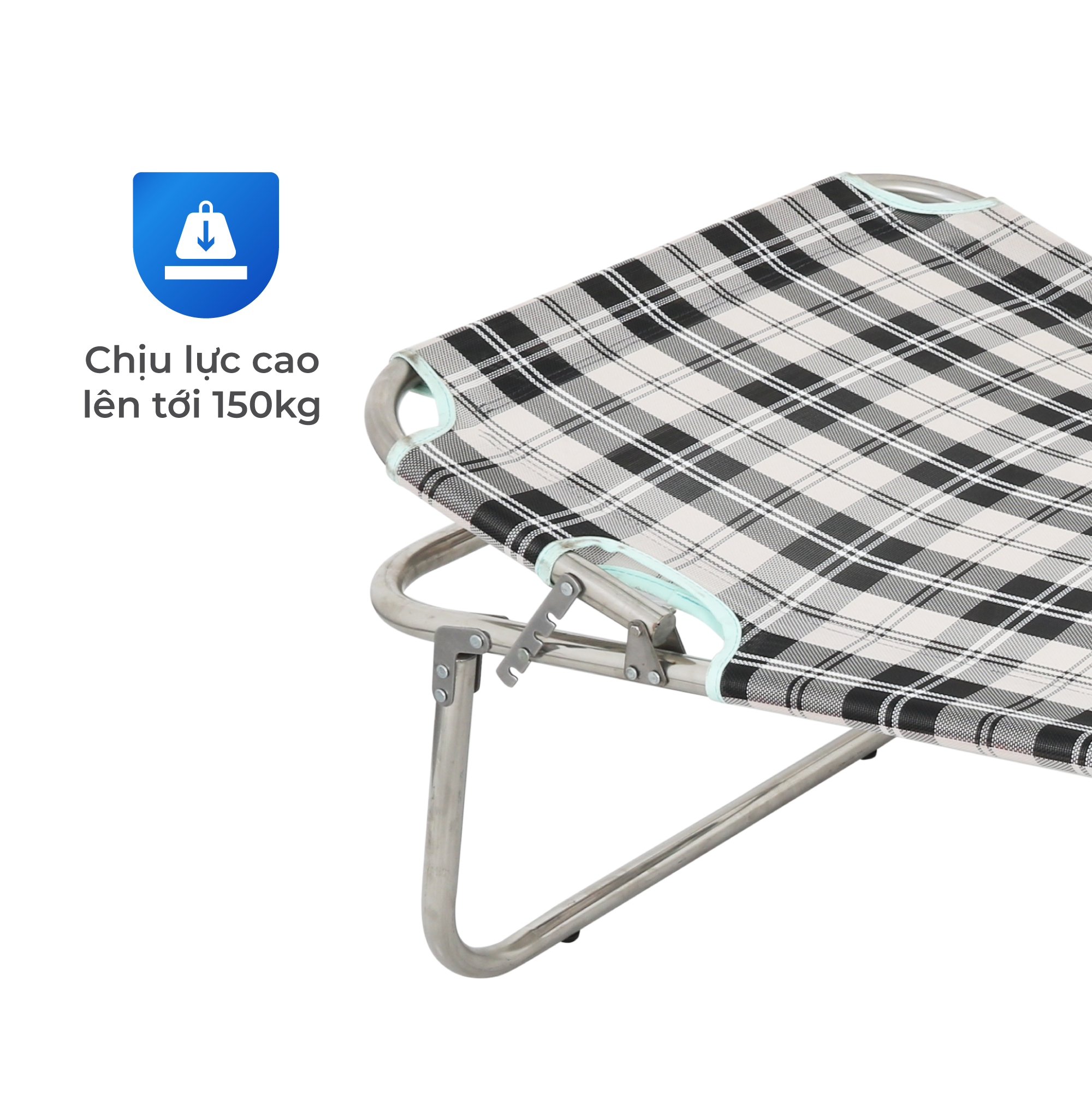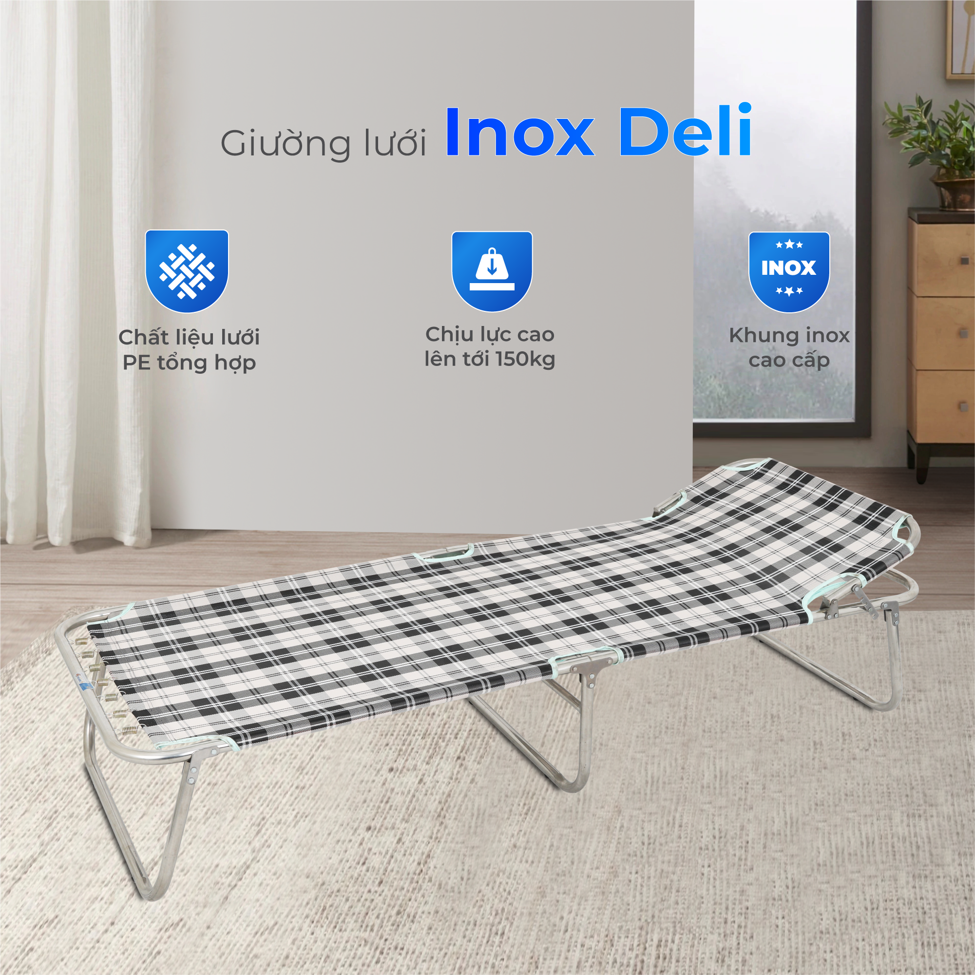 Giường lưới Deli Inox có mặt nằm bằng lưới cao cấp, chịu lực tốt, thoáng khí, không thấm mồ hôi và dễ vệ sinh, mang lại sự thoải mái khi nghỉ ngơi. Thiết kế có nấc chỉnh đầu giúp nâng đỡ cổ gáy, tăng độ thư giãn cho người dùng. Khung inox sáng bóng, chống gỉ sét, khắc phục tình trạng khung ọp ẹp, kêu cót két gây mất an toàn. Đặc biệt, giường xếp gọn thông minh, dễ di chuyển và cất giữ, phù hợp cho cả gia đình, văn phòng hay dã ngoại.