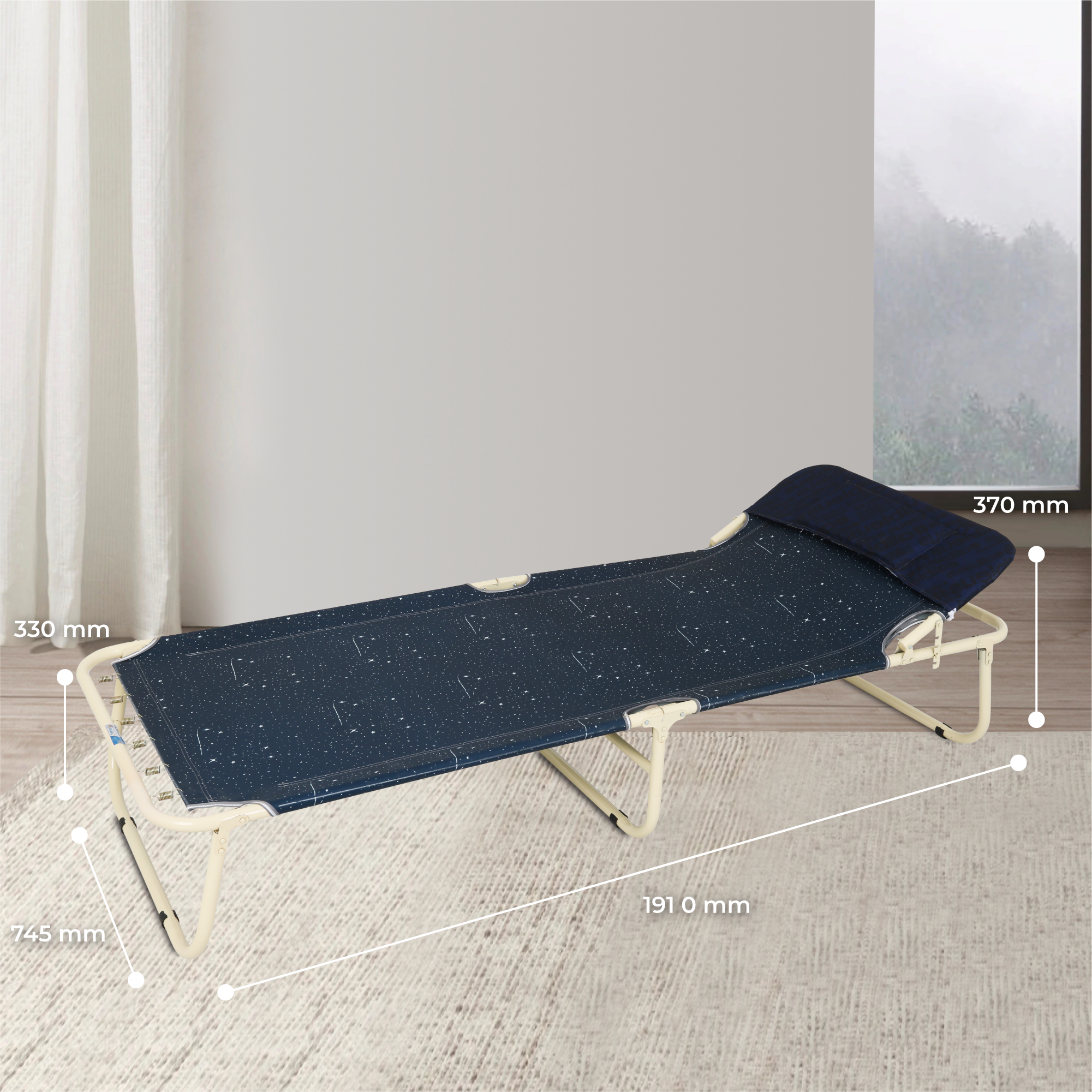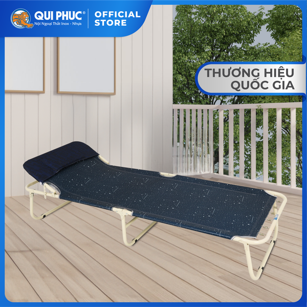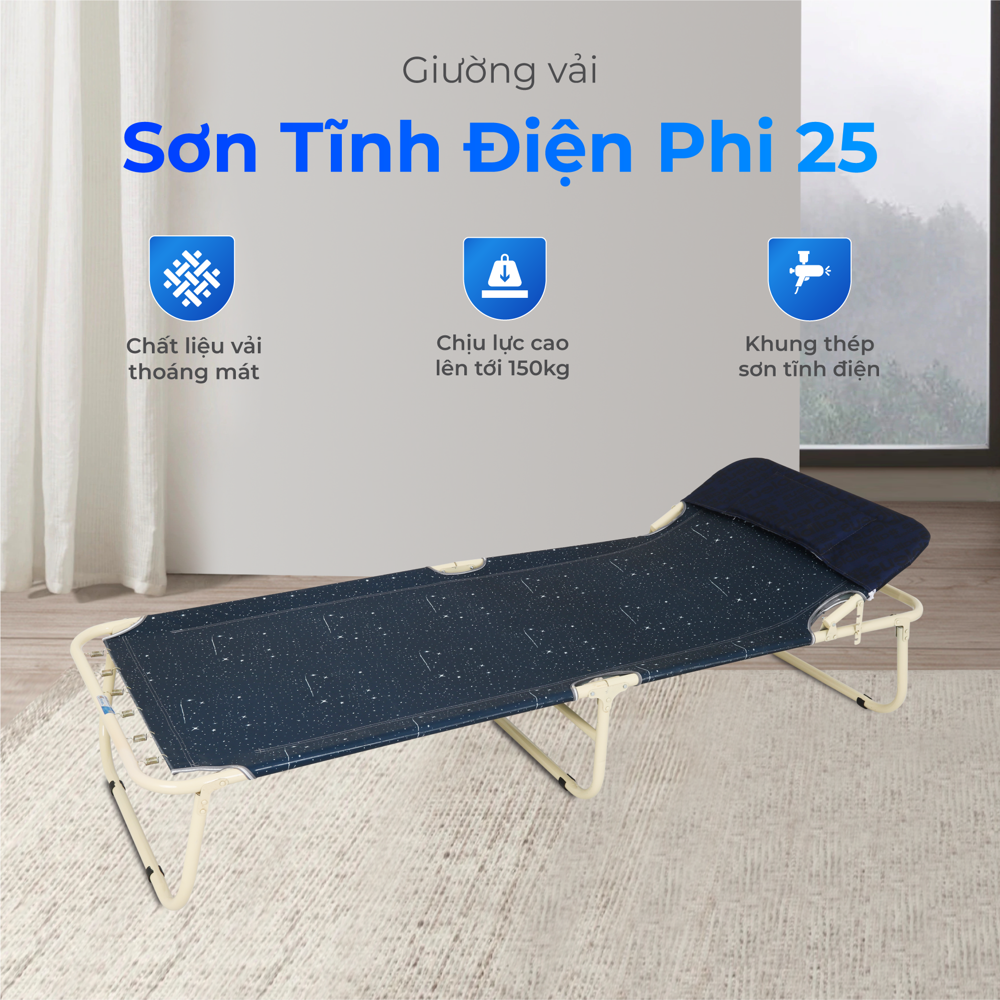 Giường vải màu kem phi 25 thiết kế gập gọn thông minh, dễ dàng di chuyển và tiết kiệm diện tích, có khung sắt sơn tĩnh điện bền bỉ, chống gỉ sét và chịu lực tốt, khắc phục tình trạng giường ọp ẹp, phát ra tiếng cót két kém an toàn. Mặt giường làm từ vải cao cấp thoáng khí, êm ái, giúp nằm lâu vẫn dễ chịu, không bị hầm nóng lưng. Tựa đầu có thể điều chỉnh nhiều nấc linh hoạt, phù hợp với từng tư thế nghỉ ngơi.