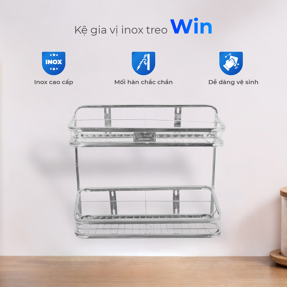 Kệ gia vị inox WIN được làm từ inox 201 cao cấp, chống gỉ sét, chịu lực tốt và bền bỉ theo thời gian. Thiết kế nhiều tầng giúp sắp xếp gọn gàng chai dầu ăn, lọ gia vị, hũ muối. Với kiểu dáng hiện đại và nhỏ gọn, kệ dễ dàng bố trí trong mọi không gian, từ căn hộ nhỏ, nhà thuê cho đến bếp gia đình, quán ăn và nhà hàng.