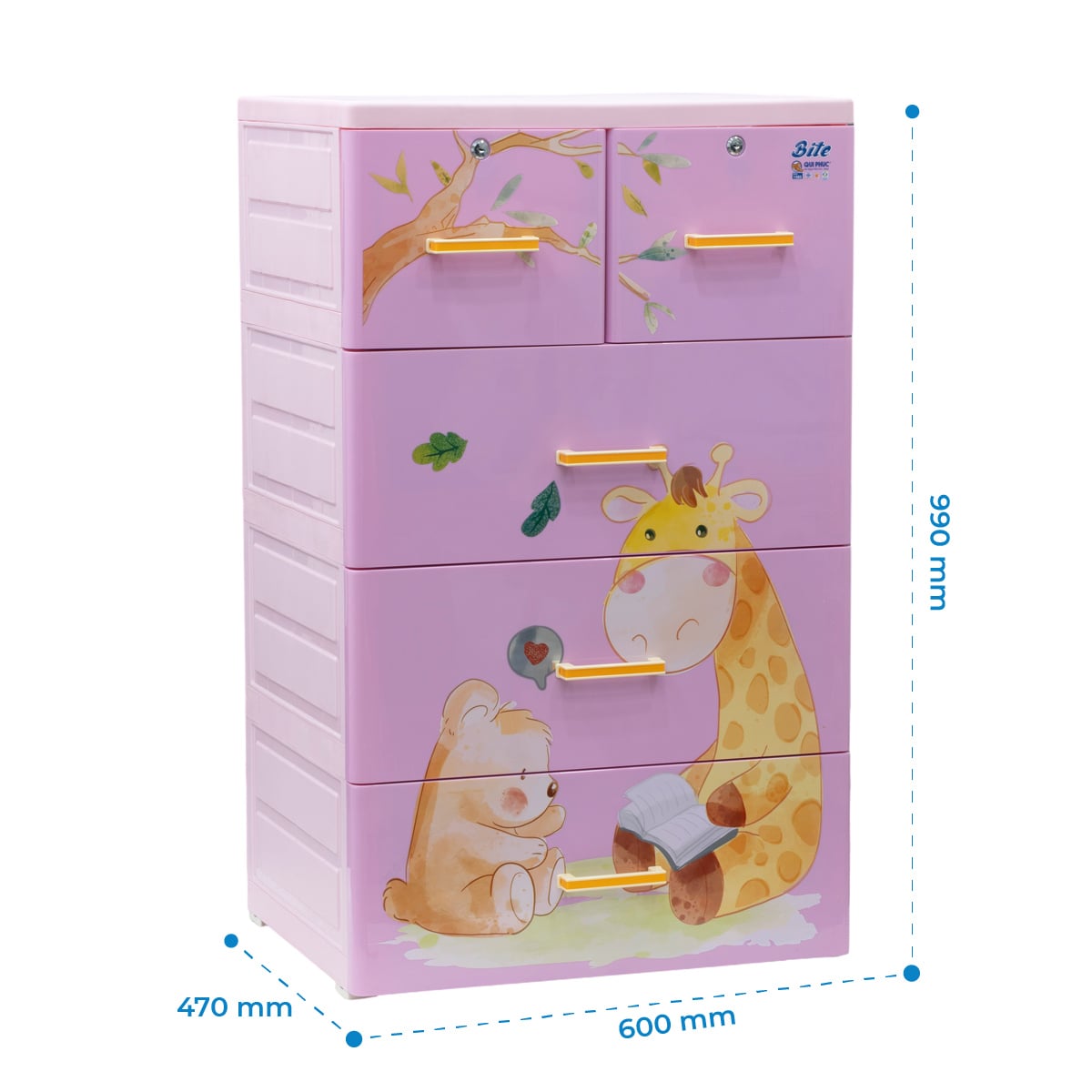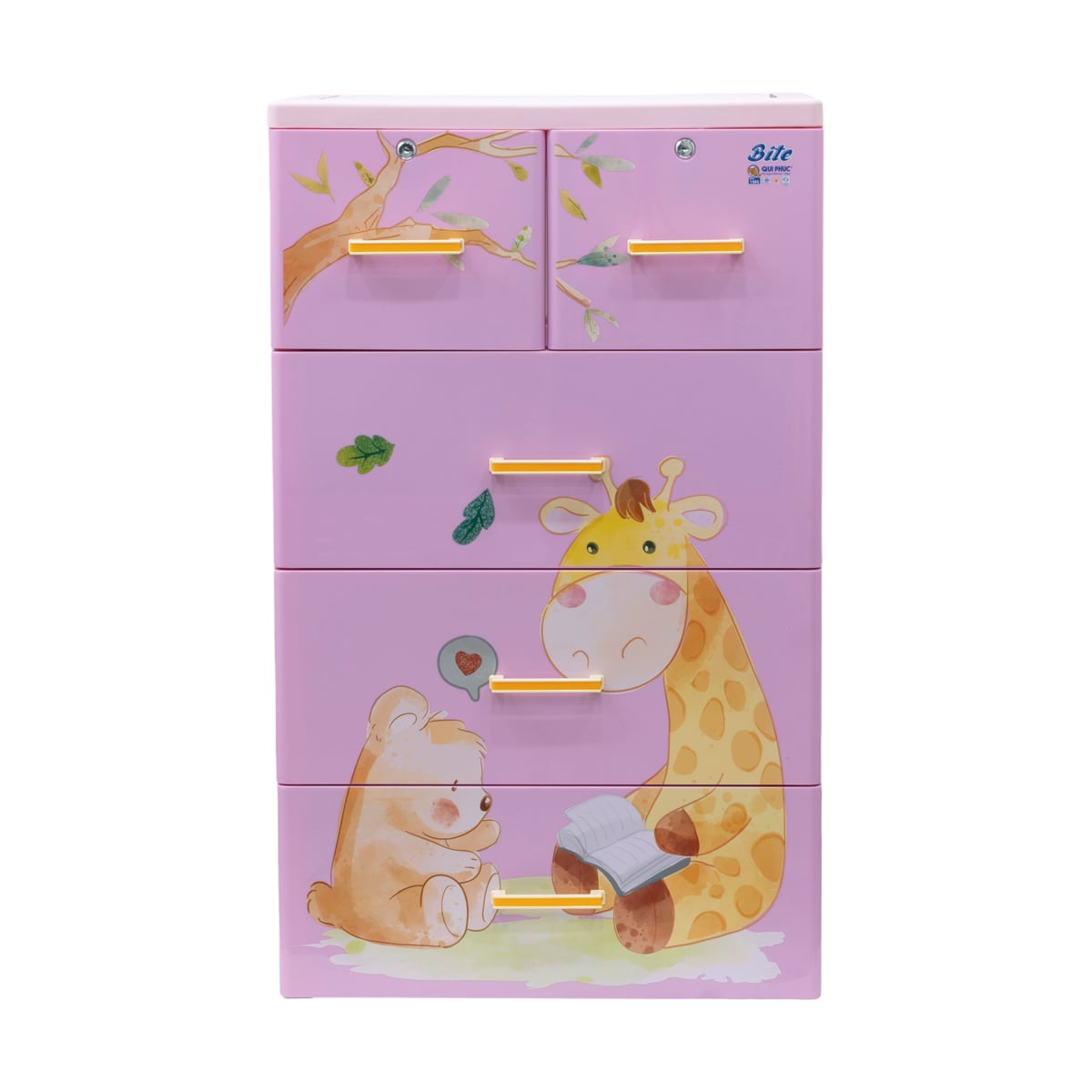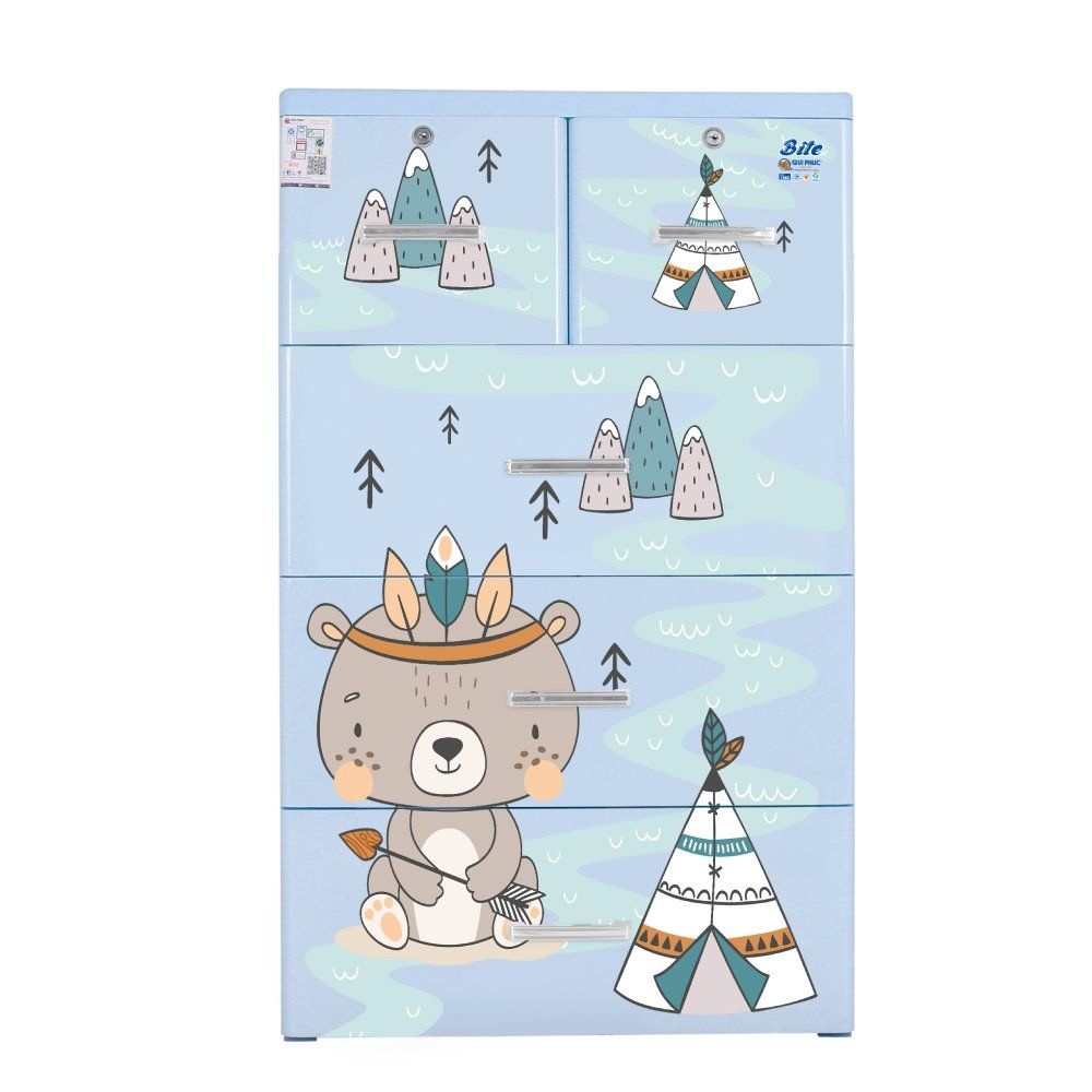 Tủ nhựa BITE sử dụng nhựa nguyên sinh không mùi, kết hợp công nghệ in họa tiết trực tiếp giúp hình ảnh dễ thương luôn sắc nét, bền màu theo thời gian. Thiết kế tủ tông pastel nhẹ nhàng, tinh tế, phù hợp với mọi phong cách phòng trẻ. Kết cấu móc nơi đáy hộc, chống bung hộc giúp cha mẹ an tâm khi bé sử dụng hàng ngày. Đây chính là giải pháp lý tưởng cho không gian sống hiện đại, vừa đảm bảo tính thẩm mỹ, vừa bảo vệ sức khỏe bé yêu từ những điều nhỏ nhất.