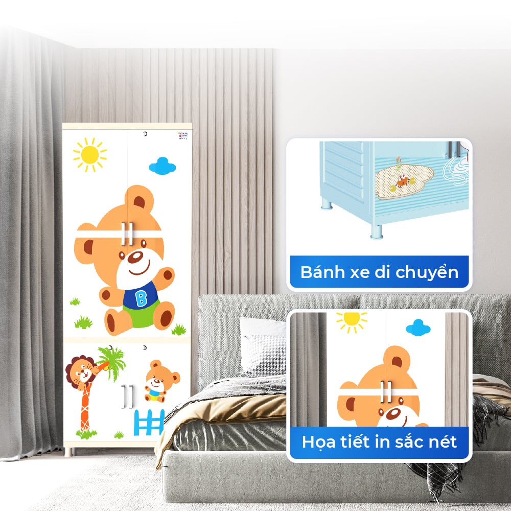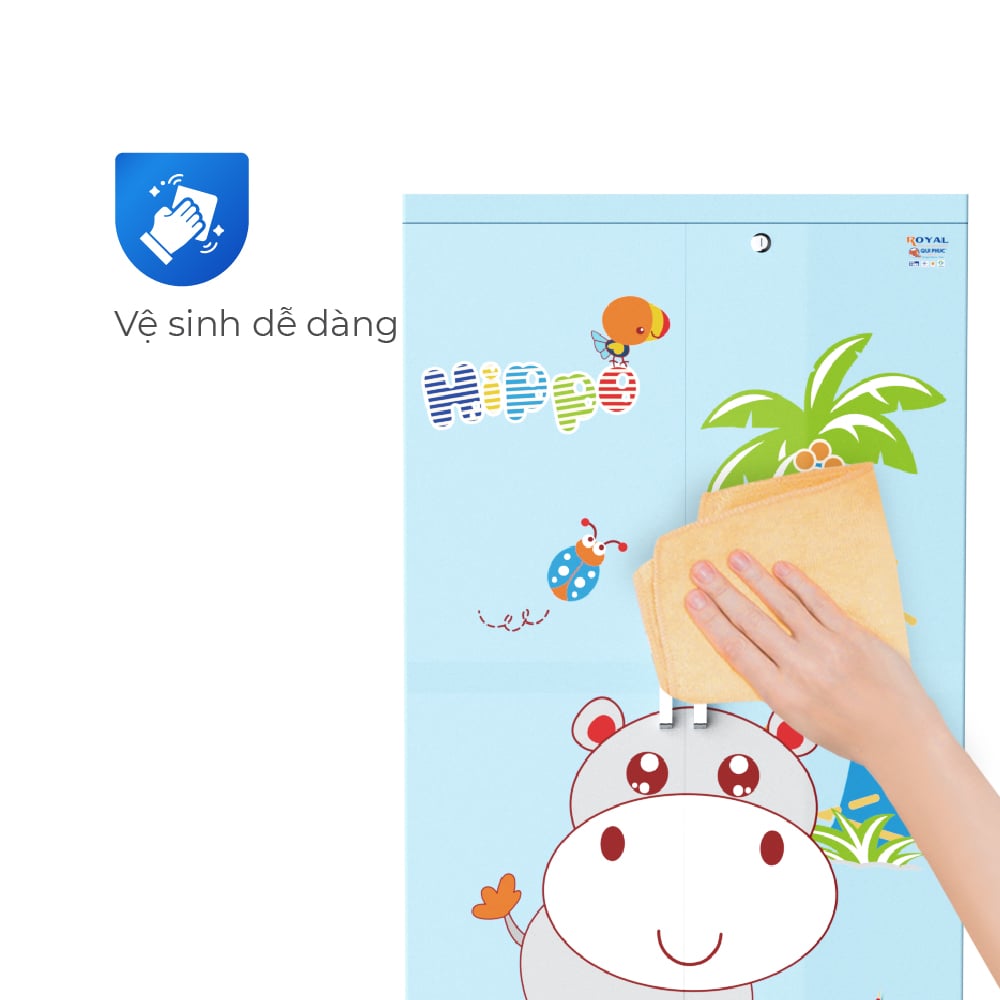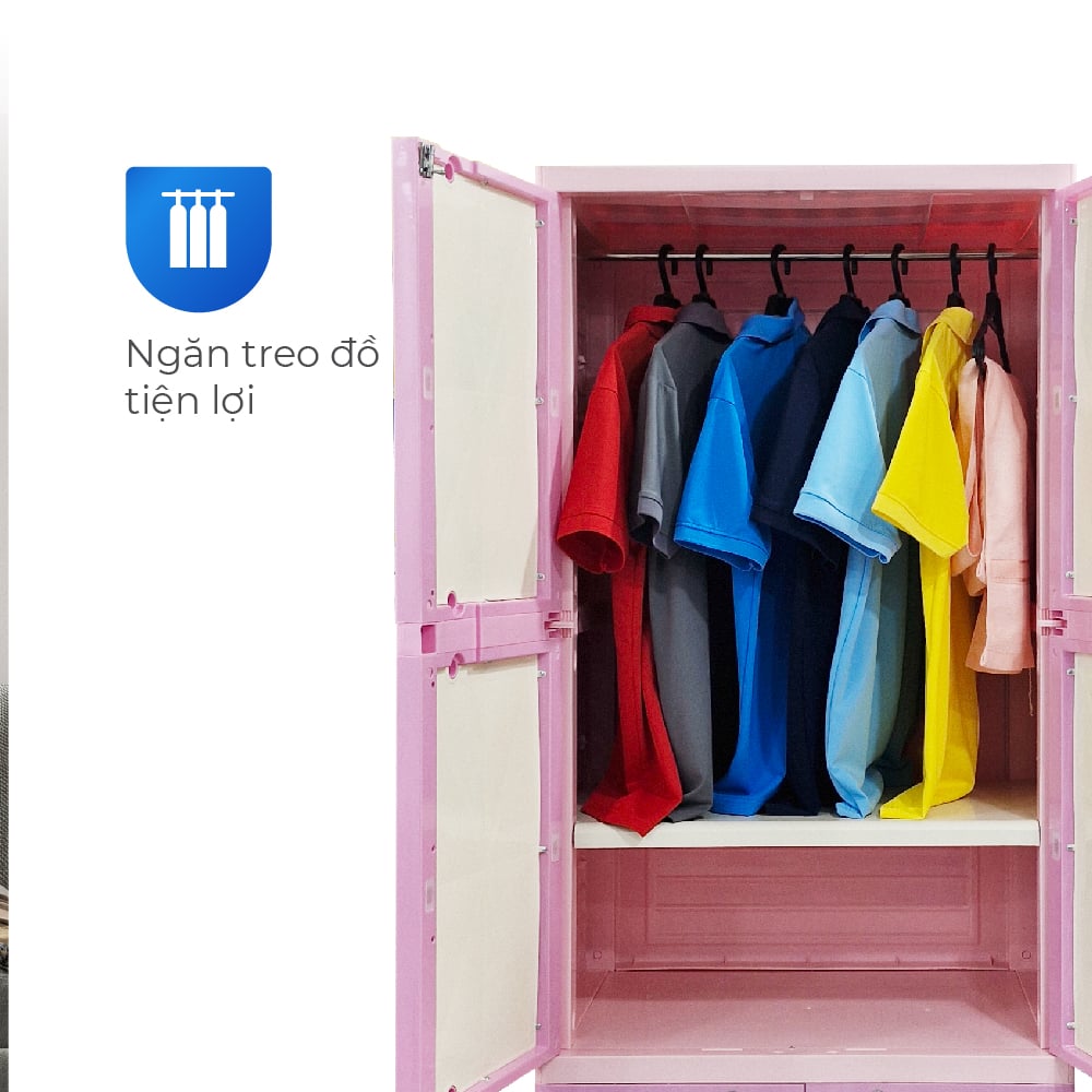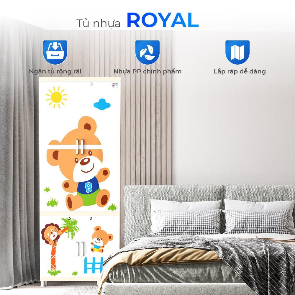 Tủ nhựa Royal sử dụng nhựa nguyên sinh an toàn, kết cấu khung vững chắc, không cong vênh, không giòn gãy theo thời gian. Thiết kế ngăn treo đồ 1100mm thẳng đứng tiện lợi, không cần gấp quần áo, kết hợp với họa tiết ngộ nghĩnh được in trực tiếp chống lem màu – vừa dễ thương, vừa bền đẹp. Bề mặt nhựa bóng mịn, ít bám bụi, dễ dàng lau chùi. Đây chính là giải pháp tủ lý tưởng dành cho các gia đình trẻ, muốn đồng bộ thẩm mỹ, an toàn và công năng trong cùng một sản phẩm